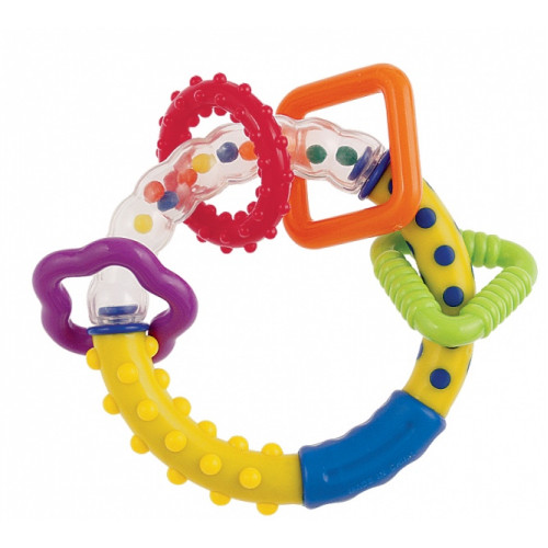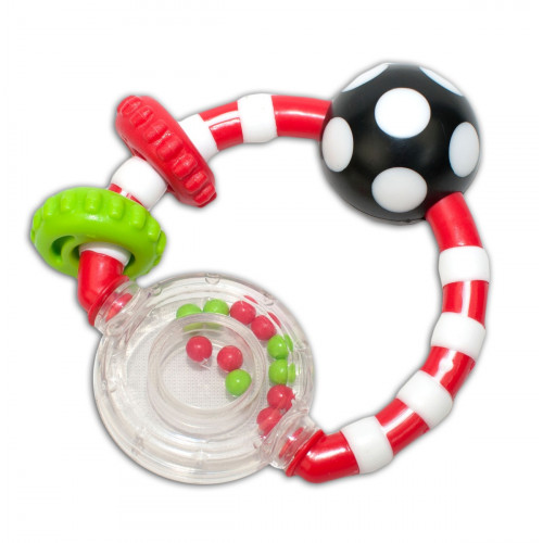 Veselo sfarbené a inovatívne tvarované hrkálku, dobre sa držiaci v malinké detskej rúčke.
