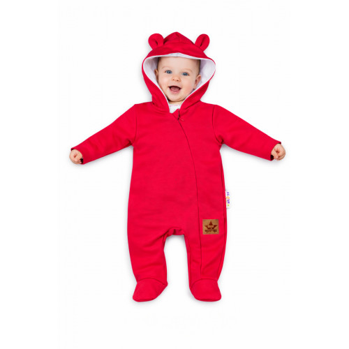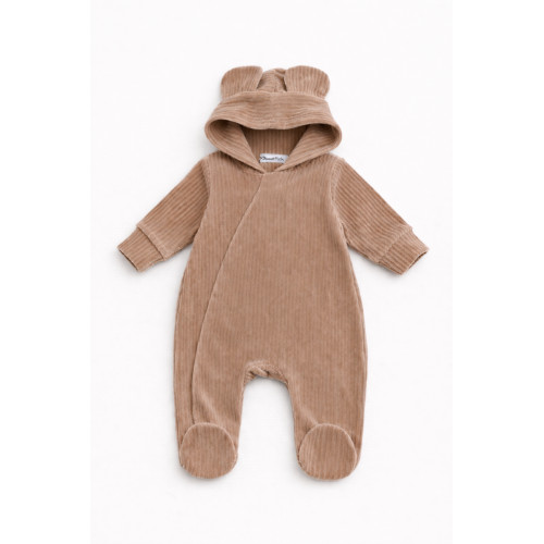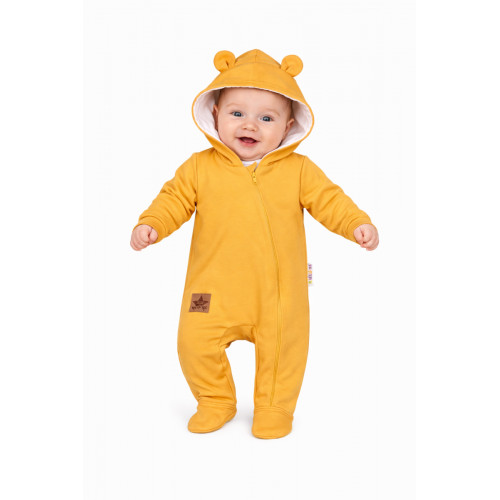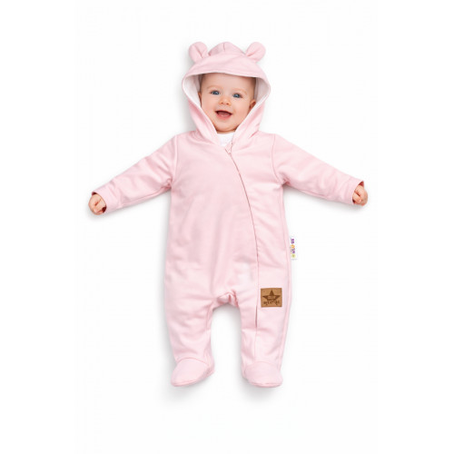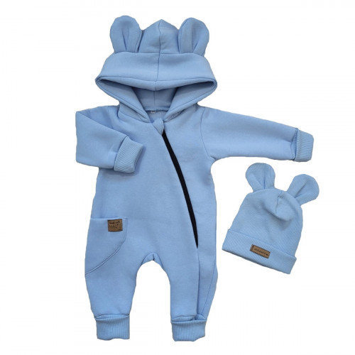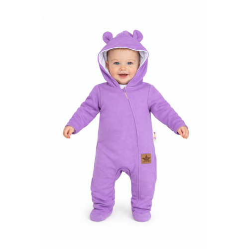 Dvojvrstvový teplejší velúrový overálek podšitý bavlnenou látkou so štýlovou kapucňou ozdobenou ušami. Celorozpínací na cvočky, čo umožňuje ľahké prezliekanie a prebaľovanie.