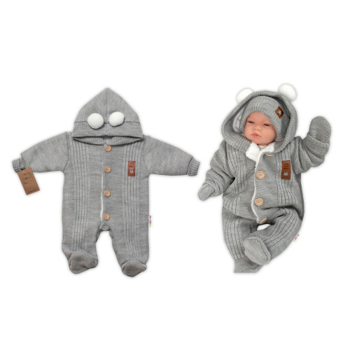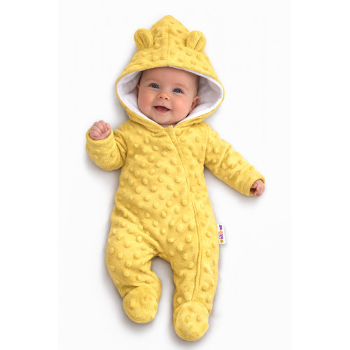 Dvojvrstvový teplejší velúrový overálek podšitý bavlnenou látkou so štýlovou kapucňou ozdobenou ušami. Celorozpínací na cvočky, čo umožňuje ľahké prezliekanie a prebaľovanie.