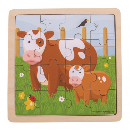 Starostlivá mamička krava dohliada na svoje malé teliatko a spoločne sa pasú na zelenej lúke.16 dielikov robustného puzzle sa vkladá na podklad s rovnakým motívom, Vaše dieťatko tak bude mať zložený o..