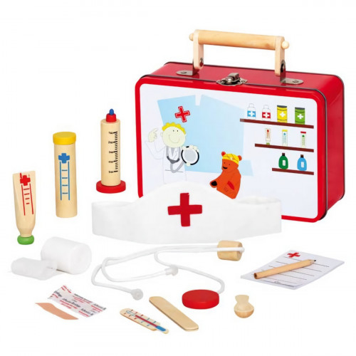 Drevený lekársky kufrík pre malé lekára. Ideálne pre hranie, u ktorých si deti skutočne dlho vyhrajú. Môžu tak preskúmavať svet dospelých a užiť si pri tom veľa zábavy. Deti kufor samy ľahko otvoria, ..