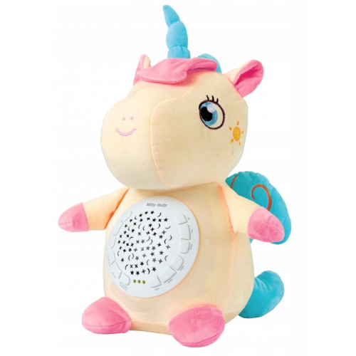 Krídla postavičky sú vyrobené z mäkkej žuvacej gumy. Rôzne povrchy a materiály a hrkálka vo vnútri jednorožca podporujú multizmyslový rozvoj. Praktická rukoväť umožňuje ľ..