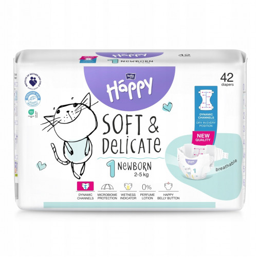 Detské plienky Bella Baby Happy Soft & Delicate Newborn (1) sú jemné jednorazové plienky určené pre novorodencov s hmotnosťou 2–5 kg. Sú navrhnuté tak, aby poskytovali maximálne pohodlie a ochranu cit..